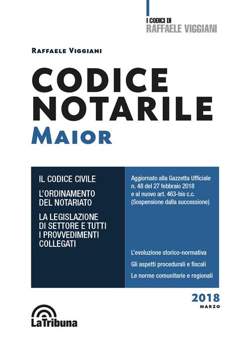 Il Codice notarile maior contiene il testo aggiornato del Codice civile, che si presenta arricchito sia da un'utilissima e approfondita raccolta di richiami e rinvìi sistematici, sia da un'ampia serie di provvedimenti speciali, con particolare attenzione riservata alle disposizioni che riguardano l'ordinamento del notariato. Il volume comprende, in particolare, l'innovativa sezione "Fingertips", la quale riassume agilmente tutte le norme complementari di maggiore interesse notarile. La pregevole struttura dell'Opera è stata pensata per consentire allo studente e all'operatore un'immediata e completa padronanza della materia, che si realizza attraverso l'indicazione in calce a ogni articolo del Codice: delle norme complementari collegate, ove opportuno riportate nel loro testo integrale; di un utilissimo quadro dell'evoluzione storico-normativa, con la segnalazione di ogni modifica intervenuta e con la pubblicazione, in appositi riquadri, del testo di legge antecedente alle riforme più recenti e significative; di puntuali richiami al regime fiscale e alle fonti regionali e comunitarie. Per la sua impostazione e il suo contenuto l'Opera rappresenta un originale e insostituibile strumento di studio e consultazione nel quale Raffaele Viggiani ha trasfuso la sua passione e la sua competenza, nel tentativo - pienamente riuscito - di creare quei collegamenti e quegli stimoli che rendono il Codice notarile maior un ausilio indispensabile per la preparazione al concorso notarile e per l'approfondimento professionale.
