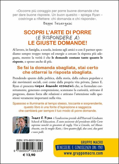 Al lavoro, in famiglia, a scuola, insieme agli amici o con il partner spendiamo sempre troppo tempo ed energie a cercare la risposta più adeguata, mentre la verità è che le domande contano tanto quanto le risposte, e spesso anche di più. Se fai la domanda sbagliata, stai certo che otterrai la risposta sbagliata. Prendendo spunto dalla politica, dalla storia, dalla cultura popolare e dai movimenti sociali, così come dalla propria vita privata, James E. Ryan ci presenta cinque domande essenziali che, se formulate correttamente, generano comprensione, scatenano la curiosità, attivano il progresso, danno forza alle relazioni e attirano l’attenzione sulle questioni veramente importanti nella vita.
