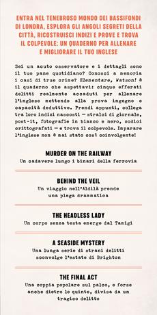 "Elementare, Watson!" è l'escape book per imparare a parlare e capire l'inglese, memorizzando tante parole nuove. Foglietti cifrati, telegrammi misteriosi, specchi ingannevoli: unisciti agli scaltri giornalisti investigativi, Annie e Peter, e avventurati tra le nebbiose strade di Londra o lungo le coste della vecchia Inghilterra. Con tips che ti aiuteranno a fare il punto sulle indagini e glossari per perfezionare la lingua, cinque capitoli ricchi di storie – in inglese e in italiano – per cinque casi da brivido tutti da risolvere. Che cosa aspetti? Risveglia lo Sherlock Holmes che è in te e diventa un asso in inglese.
