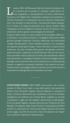 Londra, 1947. All'Elyseum Hall, nel centro di Londra, tutto è pronto per la parata in costume. Isabel Drew, attrice magnetica e manipolatrice, è il fulcro dell'evento. Accanto a lei, Edgar Port, enigmatico maestro di cerimonie, e Charity Exmouth, la scenografa che ha costruito l'imponente torre che domina il palcoscenico. Durante gli ultimi preparativi il clima si fa improvvisamente teso: alcuni membri della compagnia ricevono biglietti anonimi carichi di minacce. Uno scherzo di cattivo gusto o un presagio di sventura? Il giorno della messa in scena Isabel Drew precipita dalla torre davanti a una platea attonita. A indagare sulla morte della giovane giunge l'ispettore Cockrill, affiancato dal meticoloso collega Charlesworth. Tutto farebbe pensare a un incidente, ma quando, pochi giorni dopo, viene ritrovato il corpo di Earl Anderson, uno dei cavalieri della parata, decapitato e parzialmente bruciato, l'ispettore Cockrill intuisce che ciò che è accaduto potrebbe celare qualcosa di molto più inquietante. Messi sotto pressione, i compagni di Isabel si lasciano sfuggire alcuni dettagli: non è la prima volta che si riuniscono, si conoscono da tempo, e a legarli è un passato coloniale. Così, mentre un risentimento antico serpeggia nelle loro parole, una rete di rancori e tradimenti si allunga dietro le maschere di scena.
