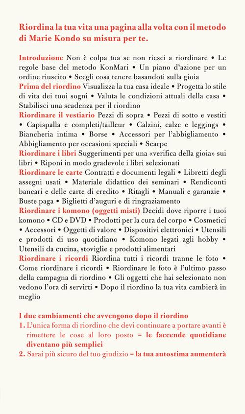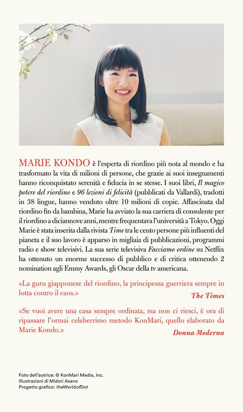 Il primo planner che aiuta giorno per giorno a rivoluzionare la tua casa e la tua vita. Marie Kondo ci regala un libro che è insieme un'agenda, un diario e un manuale per mettere in pratica quotidianamente il suo celebre metodo. Grazie a test, suggerimenti e tabelle potrai mettere nero su bianco obiettivi, sensazioni ed emozioni per realizzare i tuoi desideri. Ordina i pensieri, crea il mindset giusto e riordina i tuoi spazi ottenendo risultati a lungo termine. Liberati dal caos dentro e fuori di te modificando il rapporto con la tua casa, creando un'oasi di pace e felicità. Rivaluta le relazioni con gli oggetti che possiedi, imparando a riconoscere il loro giusto ruolo nella tua vita. Costruisci un futuro ricco di gioia, in cui avrà spazio solo ciò che conta davvero. Riordina la tua vita una pagina alla volta con il metodo di Marie Kondo su misura per te.