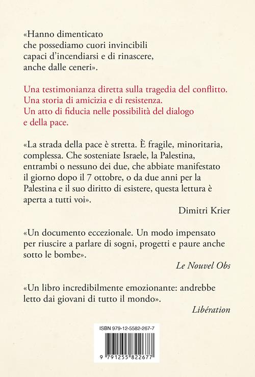 Tala, palestinese di Città di Gaza, e Michelle, israeliana di Sderot, vivono a una dozzina di chilometri l’una dall’altra, separate da un muro e da una guerra. I loro mondi non potrebbero essere più distanti. Cresciute per odiarsi, accettano di scriversi grazie a un’idea di Dimitri Krier, giornalista del «Nouvel Obs», che le mette in contatto. Così, dal marzo 2024 fino al luglio 2025, nonostante i pericoli che un semplice scambio di lettere può comportare per entrambe, si scrivono. Nel caos della guerra – sotto il tiro dei razzi, tra il rumore delle sirene – mentre tutt’intorno dominano la sofferenza e il lutto, avviene un incontro autentico. Michelle e Tala non cercano di riconciliarsi, ma condividono le loro verità: le loro lettere parlano della quotidianità, degli studi di diritto, delle loro paure, ma anche dei libri preferiti, dei sogni, dei progetti per l’avvenire. Del dolore. Del desiderio di un futuro diverso. La loro corrispondenza non è soltanto un documento eccezionale. È la prova scritta che, se è possibile un dialogo tra questi due «cuori invincibili», allora è possibile per tutti gli altri. In attesa del momento in cui, per dirla con le parole di Tala, «la finiremo di venerare i morti e di combattere i vivi».