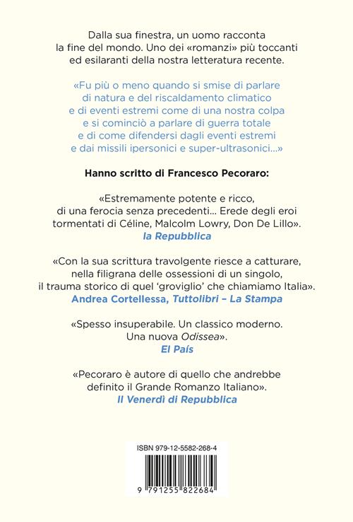 Roma, duemilaventi e rotti; un’Italia, un mondo simili ma non identici ai nostri. Un narratore avanti con gli anni, residente nell’«Ipotassi Cetomedioide», roccaforte piccoloborghese a ridosso del centro storico, prende il consueto caffè di cialda sul tavolo di cucina dell’appartamento che condivide con la compagna Carla. Parla fra sé: ricorda, disprezza, rimpiange, sogna, teme, scevera il tempo passato, la storia in cui è immerso, il poco futuro che sente di avere. Fantasie, memorie, ossessioni dell’uomo vertono sulla fine di un mondo – la fine del mondo? – e di un’esistenza, dando forma a una lettura integrale della nostra epoca, memorabile per intensità, umorismo, lucidità, crudeltà, stile. In questo libro, care lettrici e cari lettori, non sentirete il bisogno di una trama; potrete finalmente farne a meno! Ma il nostro uomo, questo sì, racconta: racconta la sua vita, racconta dell’amata Isola greca e dei suoi personaggi «più umani» di noi, racconta la città demmerda in cui vive, la nazione fascistoide che è diventata la nostra, racconta la Rete, racconta la molteplice, deprecabile e ammirevole umanità di cui partecipiamo. Racconta la realtà senza esserle servo, implicitamente ribellandosi, eppure – ripete l'uomo con amara ironia – accettandola. Con La fine del mondo, Francesco Pecoraro ci offre un «romanzo» ai confini del genere, sommamente divertente, di vertiginosa intelligenza, di commozione assoluta e profondamente innovativo, confermandosi tra i pochi scrittori italiani degni della grande modernità letteraria.