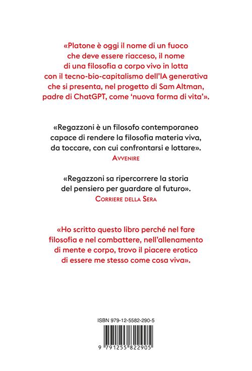 Scrivere oggi un libro sull'IA significa scrivere un libro che l'IA non avrebbe potuto ‘generare', perché senza corpo, senza vita, senza inconscio, senza desiderio, senza amore. Quando Platone afferma che la filosofia non è semplice amore per il sapere ma ‘desiderio di generare nel bello secondo il corpo e secondo l'anima' parla direttamente a noi e ci ricorda che pensare è una forma di ‘generazione vitale' che mette in gioco il corpo e la forza vitale che lo muove. Ecco la sfida, oggi. Possiamo farci sostituire nella nostra facoltà di pensare da una tecnologia in mano alle Big Tech o possiamo tenere vivo il fuoco della filosofia per sfidare il tecno-bio-capitalismo che ci propone l'IA come ‘nuova forma di vita'. Non si tratta di dire che l'IA è un mero strumento senza intelligenza. L'IA è una forma di intelligenza tecnologica come ricombinazione di sapere saputo che perfeziona, velocizzandola ed eliminandone la fatica, un'idea di intelligenza che per molto tempo abbiamo privilegiato rimuovendo il corpo. Che fare? Rimettere in gioco la forza del corpo vivo, facendo tesoro di quelle forme di pensiero che non hanno mai rinunciato al corpo: letteratura, psicoanalisi, teatro, sport. Sì, lo sport, amato da Platone, che sa essere uno spazio di pensiero incarnato, a corpo vivo. Ecco allora che per ereditare Platone nell'epoca dell'IA occorre farlo incontrare con il più grande sportivo di tutti i tempi che è stato anche uno straordinario pensatore, Muhammad Ali.