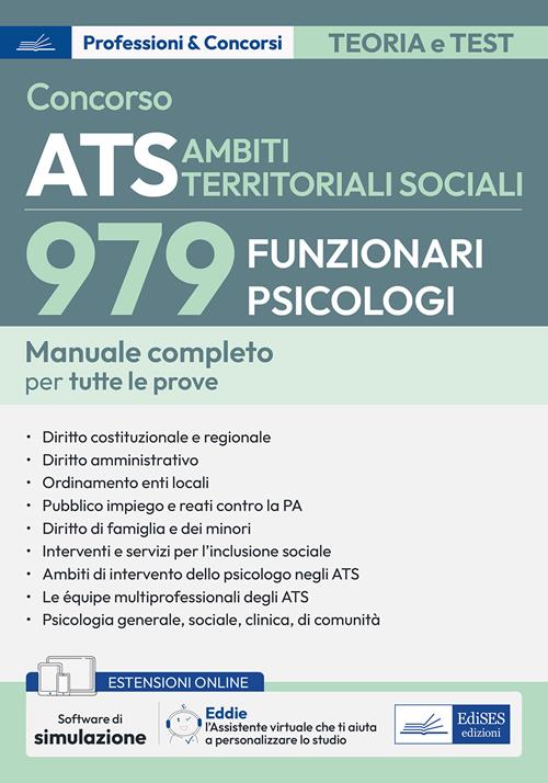 Il volume si rivolge a quanti intendono prepararsi al concorso per 979 Funzionari Psicologi presso gli ATS (Ambiti Territoriali Sociali). Il testo, aggiornato alle più recenti novità normative, comprende tutte le materie oggetto delle prove concorsuali, partendo dalle discipline di base (diritto costituzionale, regionale, amministrativo, ordinamento istituzionale degli enti locali, pubblico impiego e reati contro la P.A., diritto di famiglia e dei minori) e proseguendo con quelle specialistiche per il profilo professionale richiesto (sistema integrato di interventi e servizi per l’inclusione sociale, psicologia generale, sociale, clinica, di comunità, competenze e ambiti di intervento dello psicologo negli ATS, équipe multiprofessionali). Il manuale è completato da test a risposta multipla online e dal software con cui effettuare verifiche e simulare lo svolgimento della prova. Infine, Eddie, il nuovo assistente virtuale EdiSES basato sull'Intelligenza Artificiale, capace di riassumere i capitoli, spiegare le definizioni chiave e "interrogare" con una sezione di quiz.