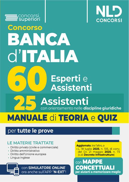La Banca d'Italia ha indetto il concorso pubblico per l'assunzione a tempo indeterminato di un contingente complessivo di n.60 unità, di cui 35 Esperti e 25 Assistenti con orientamento nelle discipline giuridiche. Il profilo Assistenti del Concorso Banca d'Italia svolge compiti operativi a supporto delle attività giuridiche e amministrative: gestione documentale, supporto ai procedimenti, attività amministrativa nelle strutture centrali e territoriali. Il Manuale per il concorso Banca d'Italia, 25 Assistenti con orientamento nelle discipline giuridiche. Teoria e Quiz Per tutte le prove di NLD Concorsi, 2025 si caratterizza per una trattazione completa, aggiornata e, al contempo, schematica e fluida di tutte le materie indicate nel programma allegato al bando per le prove scritta e orale: Diritto privato(civile e commerciale); Diritto amministrativo; Diritto dell'Unione europea; Lingua inglese. Il Volume tiene conto delle più recenti novità legislative, tra cui quelle introdotte dalla L.18 luglio 2025, n. 105, di conv. del D.L. 21 maggio 2025, n. 73 (c.d. Decreto infrastrutture). Per consentire di saggiare la preparazione, il Manuale presenta quiz di verifica suddivisi per ciascuna Parte o per singoli Capitoli che compongono le indicate materie. Il Manuale per il concorso Banca d'Italia, 25 Assistenti con orientamento nelle discipline giuridiche. Teoria e Quiz Per tutte le prove permette, infine, l'accesso ad un'estensione online consultabile con apposita password per rimanere sempre aggiornati sulle materie trattate e per accedere al simulatore online.