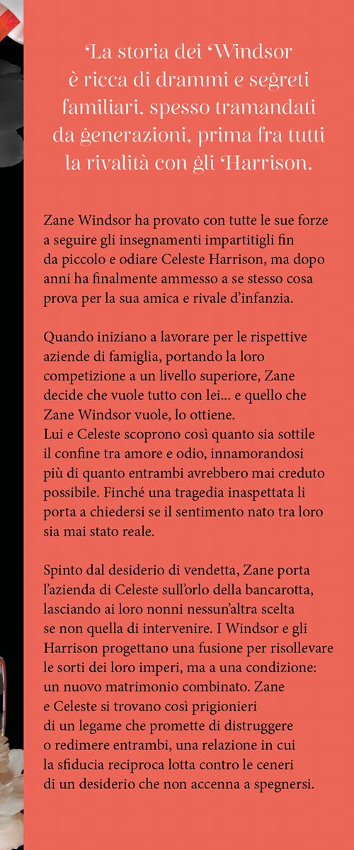 Lei è la sua principale rivale in affari. Lui è il suo più grande rimpianto in amore. La storia dei Windsor è ricca di drammi e segreti familiari, spesso tramandati da generazioni, prima fra tutti la rivalità con gli Harrison. Zane Windsor ha provato con tutte le sue forze a seguire gli insegnamenti impartitigli fin da piccolo e odiare Celeste Harrison, ma dopo anni ha finalmente ammesso a se stesso cosa prova per la sua amica e rivale d'infanzia. Quando iniziano a lavorare per le rispettive aziende di famiglia, portando la loro competizione a un livello superiore, Zane decide che vuole tutto con lei... e quello che Zane Windsor vuole, lo ottiene. Lui e Celeste scoprono così quanto sia sottile il confine tra amore e odio, innamorandosi più di quanto entrambi avrebbero mai creduto possibile. Finché una tragedia inaspettata li porta a chiedersi se il sentimento nato tra loro sia mai stato reale. Spinto dal desiderio di vendetta, Zane porta l'azienda di Celeste sull'orlo della bancarotta, lasciando ai loro nonni nessun'altra scelta se non quella di intervenire. I Windsor e gli Harrison progettano una fusione per risollevare le sorti dei loro imperi, ma a una condizione: un nuovo matrimonio combinato. Zane e Celeste si trovano così prigionieri di un legame che promette di distruggere o redimere entrambi, una relazione in cui la sfiducia reciproca lotta contro le ceneri di un desiderio che non accenna a spegnersi.
