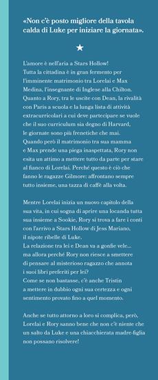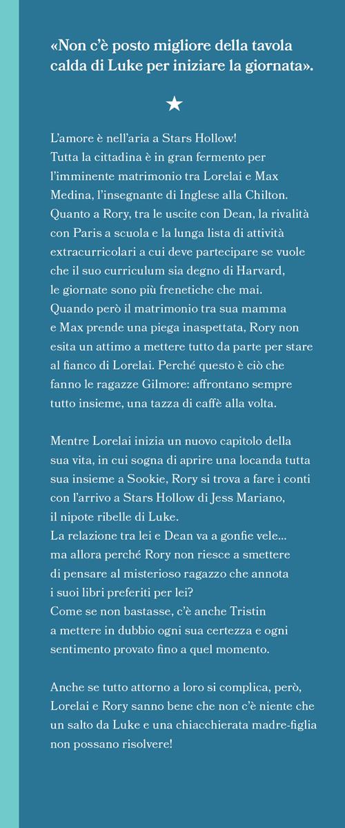 L’amore è nell’aria a Stars Hollow! Tutta la cittadina è in gran fermento per l’imminente matrimonio tra Lorelai e Max Medina, l’insegnante di Inglese alla Chilton. Quanto a Rory, tra le uscite con Dean, la rivalità con Paris a scuola e la lunga lista di attività extracurricolari a cui deve partecipare se vuole che il suo curriculum sia degno di Harvard, le giornate sono più frenetiche che mai. Quando però il matrimonio tra sua mamma e Max prende una piega inaspettata, Rory non esita un attimo a mettere tutto da parte per stare al fianco di Lorelai. Perché questo è ciò che fanno le ragazze Gilmore: affrontano sempre tutto insieme, una tazza di caffè alla volta. Mentre Lorelai inizia un nuovo capitolo della sua vita, in cui sogna di aprire una locanda tutta sua insieme a Sookie, Rory si trova a fare i conti con l’arrivo a Stars Hollow di Jess Mariano, il nipote ribelle di Luke. La relazione tra lei e Dean va a gonfie vele… ma allora perché Rory non riesce a smettere di pensare al misterioso ragazzo che annota i suoi libri preferiti per lei? Come se non bastasse, c’è anche Tristin a mettere in dubbio ogni sua certezza e ogni sentimento provato fino a quel momento. Anche se tutto attorno a loro si complica, però, Lorelai e Rory sanno bene che non c’è niente che un salto da Luke e una chiacchierata madre-figlia non possano risolvere!