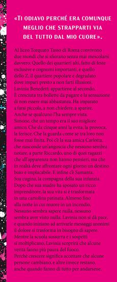 Al liceo Torquato Tasso di Roma convivono due mondi che si sfiorano senza mai mescolarsi davvero. Quello dei quartieri alti, fatto di feste esclusive e cognomi importanti, e quello dello Z, il quartiere popolare e degradato dove impari presto a non farti illusioni. Lavinia Benedetti appartiene al secondo. È cresciuta tra bollette da pagare e la sensazione di non essere mai abbastanza. Ha imparato a farsi piccola, a non chiedere, a sparire. Anche se qualcuno l’ha sempre vista. Simone, che un tempo era il suo migliore amico. Che da cinque anni la evita, la provoca, la ferisce. Che la guarda come se tra loro non fosse mai finita. Poi c’è la sua amica Carlotta, che nasconde un’angoscia che nessuno sembra notare, a parte Riccardo, uno di quei ragazzi che all’apparenza non hanno pensieri, ma che in realtà deve affrontare ogni giorno un destino buio e implacabile. E infine c’è Samanta. Sua cugina, la compagna della sua infanzia. Dopo che sua madre ha sposato un ricco imprenditore, la sua vita si è trasformata in una cartolina patinata. Almeno fino alla notte in cui muore in un incendio. Nessuno sembra sapere nulla, nessuno sembra aver visto nulla. Lavinia non si dà pace, e quando iniziano ad arrivarle messaggi anonimi il dolore si trasforma in bisogno di sapere. Mentre la scuola sussurra e i sospetti si moltiplicano, Lavinia scoprirà che alcune verità fanno più paura del fuoco. Perché crescere significa accettare che alcune persone cambiano, e altre invece restano, anche quando fanno di tutto per andarsene.