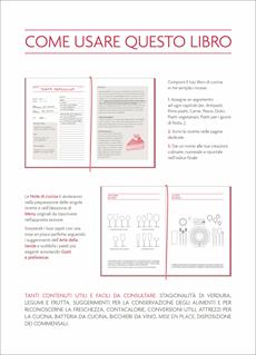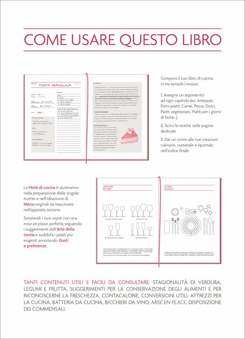 Componi il tuo libro di cucina in tre semplici mosse: assegna un argomento ad ogni capitolo (es. Antipasti, Primi piatti, Carne, Pesce, Dolci, Piatti vegetariani, Piatti per i giorni di festa…); scrivi le ricette nelle pagine dedicate; dai un nome alle tue creazioni culinarie, numerale e riportale nell’indice finale. Le note di cucina ti aiuteranno nella preparazione delle singole ricette e nell’ideazione di menu originali da trascrivere nell’apposita sezione. Sorprendi i tuoi ospiti con una mise en place perfetta seguendo i suggerimenti dell’Arte della tavola e soddisfa i palati più esigenti annotando gusti e preferenze. Alle sezioni già presenti nell’edizione originale – 365 giorni di verdure e legumi, 365 giorni di frutta, il contacalorie, le conversioni utili, gli attrezzi per la cucina, i bicchieri da vino, la mise en place, la disposizione dei commensali ecc… – si aggiungono, nella nuova edizione, anche altre novità: suggerimenti per riconoscere la freschezza degli alimenti, suggerimenti per la conservazione e panoramica della batteria da cucina.