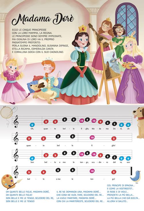 Un libro che è anche uno strumento musicale: dotato di una tastiera di due ottave complete, questo libro pianoforte a tema principesse è uno strumento divertente per imparare a cantare e a suonare alcuni canti tradizionali come ad esempio “Madama Dorè” e “Tanti auguri”. Grazie ai testi delle canzoni e agli spartiti semplicissimi che riportano i numeri dei tasti al posto delle note, chiunque può diventare un abile pianista! Età di lettura: da 4 anni.