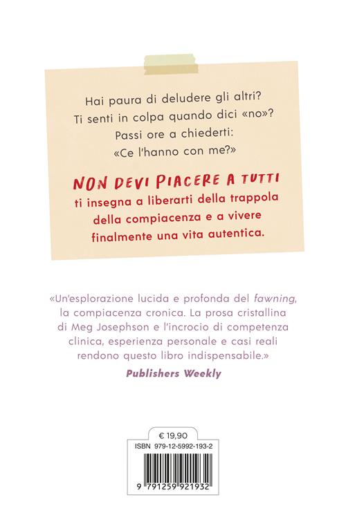 Ti è mai capitato di dire «sì» quando avresti voluto dire «no»? Di passare ore a rimuginare su un messaggio non ricevuto o su uno sguardo interpretato come freddo? Di sentirti responsabile delle emozioni altrui, di giustificarti continuamente, di non sapere più chi sei davvero quando non stai cercando di compiacere qualcuno? Questo libro parla di te. E di milioni di persone che, come te, hanno imparato fin da bambini che per essere amati e al sicuro dovevano sacrificare sé stessi. Meg Josephson, psicoterapeuta e scrittrice, ci guida in un viaggio profondo e liberatorio alla scoperta del fawning, la reazione di compiacenza cronica che nasce come strategia di sopravvivenza nell’infanzia e si trasforma in una prigione emotiva nella vita adulta. Con una voce calda, diretta e non giudicante, l’autrice intreccia la propria storia personale a quella dei suoi pazienti, offrendo una narrazione autentica che parla al cuore e alla mente.
