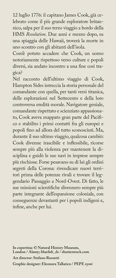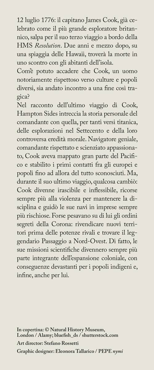 12 luglio 1776: il capitano James Cook, già celebrato come il più grande esploratore britannico, salpa per il suo terzo viaggio a bordo della HMS Resolution. Due anni e mezzo dopo, su una spiaggia delle Hawaii, troverà la morte in uno scontro con gli abitanti dell'isola. Com'è potuto accadere che Cook, un uomo notoriamente rispettoso verso culture e popoli diversi, sia andato incontro a una fine così tragica? Nel racconto dell'ultimo viaggio di Cook, Hampton Sides intreccia la storia personale del comandante con quella, per tanti versi titanica, delle esplorazioni nel Settecento e della loro controversa eredità morale. Navigatore geniale, comandante rispettato e scienziato appassionato, Cook aveva mappato gran parte del Pacifico e stabilito i primi contatti fra gli europei e popoli fino ad allora del tutto sconosciuti. Ma, durante il suo ultimo viaggio, qualcosa cambiò: Cook divenne irascibile e inflessibile, ricorse sempre più alla violenza per mantenere la disciplina e guidò le sue navi in imprese sempre più rischiose. Forse pesavano su di lui gli ordini segreti della Corona: rivendicare nuovi territori prima delle potenze rivali e trovare il leggendario Passaggio a Nord-Ovest. Di fatto, le sue missioni scientifiche divennero sempre più parte integrante dell'espansione coloniale, con conseguenze devastanti per i popoli indigeni e, infine, anche per lui.