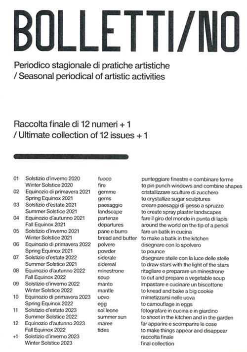 Bolletti/no è una rivista di didattica sperimentale uscita ad ogni solstizio ed equinozio nel corso di 3 anni, tra il 2020 e il 2023, per un totale di 12 numeri + un numero finale che racconta l'esperienza. Nasce dal desiderio di dare forma fisica e cartacea a una serie di pratiche sperimentate nel tempo di lavoro laboratoriale condiviso con bambini e adulti da Virginia Di Lazzaro e Giulia Filippi. In questi tre anni, le artiste e autrici del progetto hanno ragionato sul mondo che le circonda in compagnia dei personaggi, delle storie, delle pratiche e delle tecniche artistiche, dei materiali, della materia, delle stagioni e di tutte le persone e gli esseri viventi incontrate nel percorso. Ogni numero permette di stimolare esercizi di osservazione, sperimentazione, raccolta e racconto per creare una piccola collezione di arte domestica. Bolletti/no ha sperimentato con i contenuti ma anche con le forme di distribuzione nel corso degli anni: distribuito dapprima singolarmente, poi in forma di abbonamento spedito direttamente a casa di chi ha deciso di sostenere il progetto, ora diventa un cofanetto contenente tutti e 12 i numeri, + il numero speciale con i relativi poster.