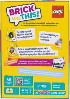Brick Like This! è un esilarante party game collaborativo in cui le squadre si sfidano in una corsa contro il tempo per costruire modelli con i celebri mattoncini LEGO®, seguendo solo le indicazioni del proprio compagno. Perfetto per serate con amici o in famiglia, questo gioco unisce divertimento, logica e comunicazione in un mix irresistibile di risate e frenesia. Come si gioca a Brick Like This!? Ogni squadra è formata da due giocatori con ruoli ben distinti: L’Istruttore guarda segretamente la carta con il modello da costruire e fornisce indicazioni verbali su come assemblare i mattoncini: "Prendi il pezzo da tre... metti il giallo sopra il rosso... spostalo un po’ a destra..." Il Costruttore esegue le istruzioni alla cieca, senza mai poter vedere la figura da realizzare. Tutte le squadre giocano contemporaneamente e il ritmo si fa incalzante: vince chi completa per primo il modello e totalizza più punti alla fine dei sei round! Ma attenzione: le Carte Sfida rendono ogni round ancora più imprevedibile! Dovrete costruire: A occhi chiusi Usando una sola mano Senza poter nominare i colori Queste sfide aumentano il livello di difficoltà e il divertimento, mettendo alla prova la vostra capacità di adattamento e intesa di squadra. Contenuto della scatola 48 Mattoncini LEGO® originali 92 Carte Figura (modelli da costruire) 20 Carte Sfida 1 Clessidra da 30 secondi 1 Regolamento completo