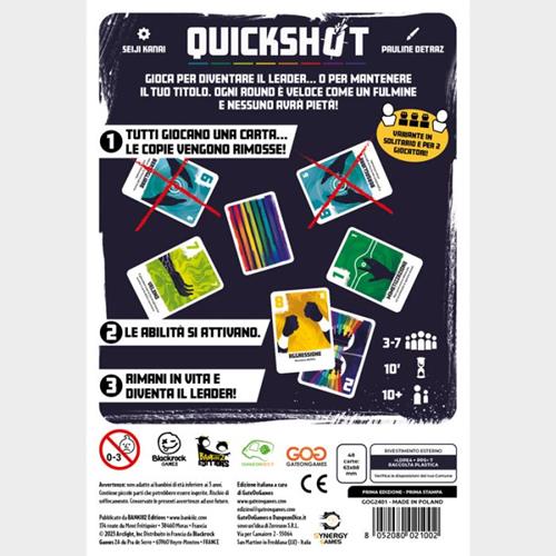 Quickshot è un gioco di carte con azioni simultanee e forte interazione diretta. Le carte giocate vengono scoperte simultaneamente e gli effetti vengono attivati: possono invertire i ranghi, far scartare una carta o far eliminare alcuni giocatori. L’ultimo giocatore che rimane vince!