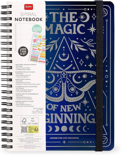 Come dice una famosa canzone americana: "se ti piace, mettici un anello". E a noi il Quaderno Spiralato a Righe Maxi a tema Moth di Legami piace così tanto che di anelli ne abbiamo messi tantissimi, su tutta la rilegatura. È il modo più comodo per accogliere i tuoi pensieri, gli appunti, gli adesivi e gli sticker e per essere sempre pronti a girare pagina verso un nuovo capitolo!. CARATTERISTICHE: 160 pagine, Carta bianca 80 g/m² e 1 foglio di adesivi. Quaderno spiralato a righe formato MAXI.. CARTA: Carta certificata FSC (FSC-C154586) proveniente da foreste ben gestite, foreste certificate FSC e da altre fonti controllate.. DIMENSIONI: 21 x 29 cm.. Abbiamo un universo di mondi a tua disposizione! Creiamo oggetti di qualità sempre diversi, colorati, positivi e divertenti, perfetti per ognuno e per ogni stato d’animo. In Legami puoi sempre trovare il tuo mondo ideale, da scoprire ed esplorare giorno per giorno: un mondo di felicità per quando sei un po’ giù, un mondo di sorprese per quando ti annoi, un mondo di ispirazioni per quando sei a corto di idee, un mondo di emozioni diverse in continua evoluzione.