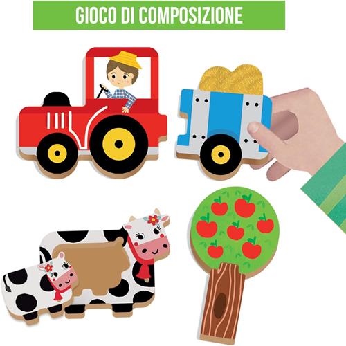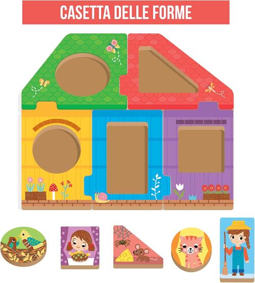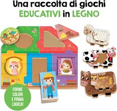 Forme, colori, numeri e prima logica!. Una divertente ed originale raccolta di giochi educativi in legno! Ci sono la casetta delle forme, il trattore dei colori, gli alberelli dei numeri, le mamme e i cuccioli ad incastro che si possono anche impilare in sequenza. Le attività sono autocorrettive, con ganci studiati per i più piccoli.. Prima logica; Forme e colori; Numeri e quantità; Manualità fine; Intelligenza prevalente coinvolta: logico-matematica; Altre intelligenze coinvolte: visivo-spaziale e corporeo cinestetica. Casetta con 5 forme geometriche; 5 alberelli con i numeri; 5 animali con 5 cuccioli; 1 trattore con 5 cestini