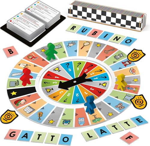 La grammatica facile e divertente per ragazzi!. Conosci davvero tutti i segreti della lingua italiana? Sfida i tuoi amici in questa grande gara con tantissimi quiz e prove di abilità in cui lessico e grammatica sono proprio un gioco da ragazzi!. Sviluppare il lessico e classificare le parole; Conoscere le prime regole di morfologia e sintassi; Raggiungere obiettivi rispettando le regole; Intelligenza prevalente coinvolta: linguistica; Altre intelligenze coinvolte: personale e logico-matematica.. 1 tabellone circolare; 1 mazzo da 55 carte-quiz; 1 spinner; 4 pedoni in legno; 72 tessere forma-parola con portatessere; 9 coccarde contagiri; 1 plancia portacarte; Regolamento