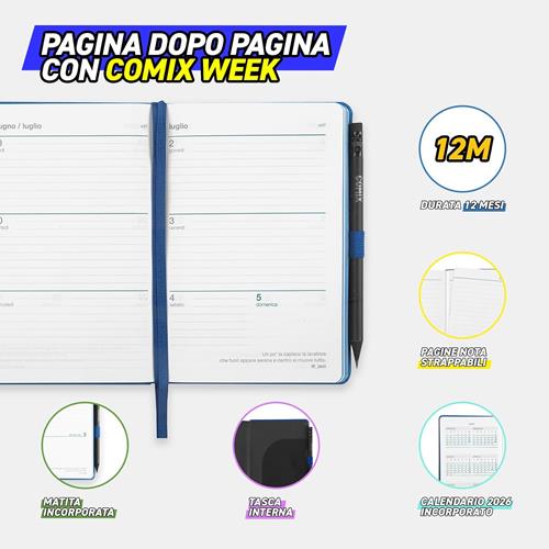 ACCESSORI COMIX: Scopri tutti gli accessori Comix per scuola, università e lavoro, dagli zaini e gli astucci in morbido poliestere, alle agende di diversi formati. AGENDA 2026: dal 1 gennaio 2026 al 31 dicembre 2026. 192 pagine con aforismi e battute d'autore. TOCCO DI STILE: copertina in PU termovirante, elastico large 8mm in tinta, doppio segnalibro, taglio colore in tinta con la copertina. Con passante elastico laterale porta matita o penna. All'interno 16 fogli pretagliati staccabili e tasca portatutto in PVC.. AGENDE COMIX 12 MESI: scopri le agende COMIX 12 mesi, disponibili in diversi formati e varianti. Inoltre, potrai scegliere tra la versione giornaliera e settimanale. COMIX: Da una costola dell'omonimo giornale di umorismo e fumetti, nel 1994 in casa Franco Cosimo Panini Editore nasce la prima agenda Comix. Oggi Comix include un'ampia gamma di prodotti per la scuola, l'università, il lavoro e il tempo libero
