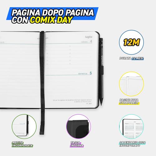 ACCESSORI COMIX: Scopri tutti gli accessori Comix per scuola, università e lavoro, dagli zaini e gli astucci in morbido poliestere, alle agende di diversi formati. AGENDA 2026: dal 1 gennaio 2026 al 31 dicembre 2026. 384 pagine con aforismi e battute d'autore. TOCCO DI STILE: copertina in PU termovirante, elastico large 8mm in tinta, doppio segnalibro, taglio colore in tinta con la copertina. AGENDE COMIX 12 MESI: scopri le agende COMIX 12 mesi, disponibili in diversi formati e varianti. Inoltre, potrai scegliere tra la versione giornaliera e settimanale. COMIX: Da una costola dell'omonimo giornale di umorismo e fumetti, nel 1994 in casa Franco Cosimo Panini Editore nasce la prima agenda Comix. Oggi Comix include un'ampia gamma di prodotti per la scuola, l'università, il lavoro e il tempo libero