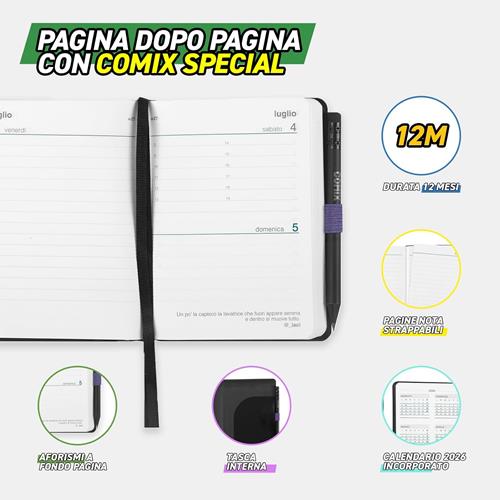 ACCESSORI COMIX: Scopri tutti gli accessori Comix per scuola, università e lavoro, dagli zaini e gli astucci in morbido poliestere, alle agende di diversi formati. AGENDA 2026: dal 1 gennaio 2026 al 31 dicembre 2026. 384 pagine con aforismi e battute d'autore. TOCCO DI STILE: copertina in PU termovirante, elastico large 8mm in tinta, doppio segnalibro. Con passante elastico laterale porta matita o penna. All'interno 16 fogli pretagliati staccabili e tasca portatutto in PVC.. AGENDE COMIX 12 MESI: scopri le agende COMIX 12 mesi, disponibili in diversi formati e varianti. Inoltre, potrai scegliere tra la versione giornaliera e settimanale. COMIX: Da una costola dell'omonimo giornale di umorismo e fumetti, nel 1994 in casa Franco Cosimo Panini Editore nasce la prima agenda Comix. Oggi Comix include un'ampia gamma di prodotti per la scuola, l'università, il lavoro e il tempo libero