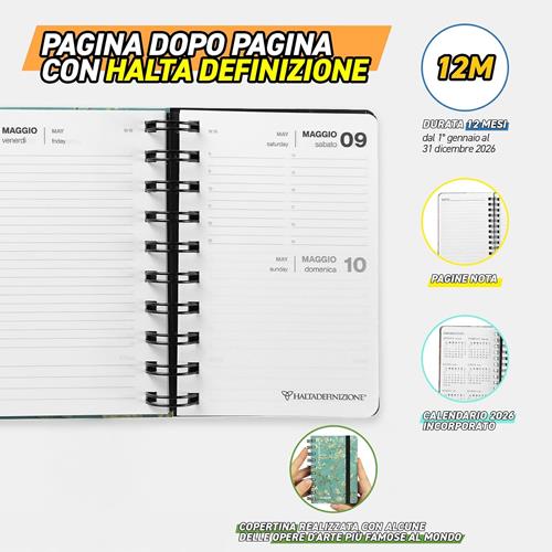 AGENDA HALTADEFINIZIONE 12 MESI: Questa agenda 12 mesi, dal 1° gennaio 2026 al 31 dicembre 2026, è ideale per organizzare le tue giornate con un tocco d'arte. ARTE E FUNZIONALITÀ: Illustrata con una delle opere d'arte più celebri, quest'agenda 2026 è arricchita da una pratica chiusura ad elastico e un doppio segnalibro integrato per un'organizzazione elegante e funzionale. TASCABILE: Grazie alle dimensioni ridotte (9x13h cm) è comoda da portare sempre con te, per prendere appunti e pianificare le tue giornate. ACCESSORI HALTADEFINIZIONE: Scopri tutti i prodotti cartotecnici di HALTADEFINIZIONE quali raccoglitori ad anelli, cartelle porta documenti, quaderni e molto altro, decorati con alcune delle opere d’arte più famose al mondo. HALTADEFINIZIONE: Una divisione di Franco Cosimo Panini Editore che ha rivoluzionato la fruizione del patrimonio storico-artistico grazie alla digitalizzazione di opere d'arte in gigapixel, mantenendo una definizione altissima