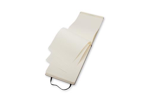 Il Taccuino Reporter large a righe ha la copertina che si apre verso l'alto e le ultime 24 pagine staccabili. Ideale per veloci appunti sul posto. Ogni taccuino Moleskine è rilegato a punto refe e ha una copertina cartonata con gli angoli arrotondati, carta senza cloro, un segnalibro, la chiusura a elastico e una tasca interna a soffietto contenente un testo che racconta la storia di Moleskine.