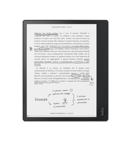 Kobo elipsa: un solo eReader. Un mondo di idee. Cattura un mondo di idee suil'ampio schermo antiriflesso da 10,3" dotato di ComfortLight. Crea i tuoi appunti personali e aggiungi annotazioni sui tuoi eBook e PDF. Trasforma le annotazioni a mano in testo digitale ed esportale su qualsiasi dispoditivo. Porta con te tutti i tuoi appunti, i PDF e i libri grazie alla memoria da 32GB. Posiziona il tuo eReader nell'angolazione ideale usando la SleepCover come supporto. Annota pensieri e idee con la Kobo Stylus (l'esperienza di scrittura a mano è consentita da MyScript). Quando vuoi fare una pausa, basta chiudere la SleepCover per proteggere Kobo Elipsa e metterlo in standby. Kobo Elipsa è allo stesso tempo un libro, un taccuino e una libreria, ed è dotato di tutto ciò che occorre per trasformare le tue idee in realtà.